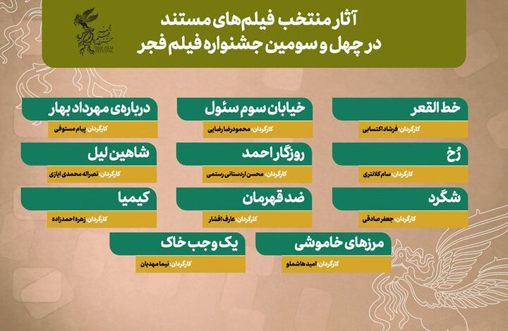 اسامی آثار بخش مسابقه مستند جشنواره چهل و سوم فیلم فجر به شرح زیر است: